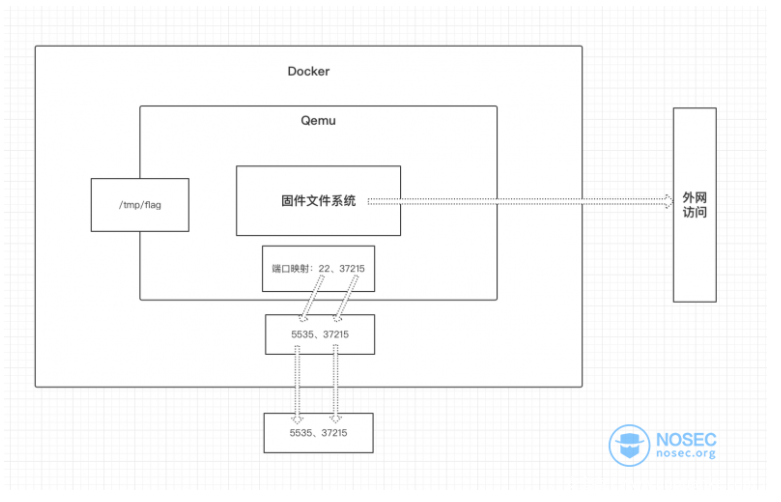 最后呢,因为qemu里我转发了1234端口,但是docker里没转发,如果想要调试的师傅可以自己转发一下