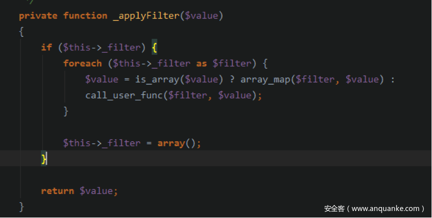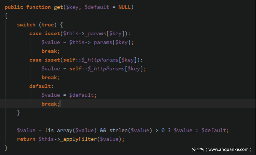 首先switch检测$key是否在$this->_params[$key]这个数组里面,如果有的话将值赋值给$value,紧着又对其他数组变量检测$key是否在里面,如果在数组里面没有检测$key,则将$value赋值成$default,最后判断一下$value类型,将$value传入到_applyFilter()函数里面,继续跟踪_applyFiter()函数。