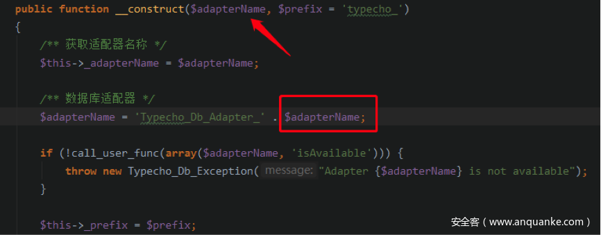 Typecho_Db的类构造函数定义在Db.php中,如图所示,Typecho_Db类构造函数使用传入过来的值进行初始化,请注意红框内部,构造函数使用第一个变量与字符串进行拼接,如果$adapterName变量为对象,则将会调用__toString()魔术方法(如果读者不明白为什么会调用__toString方法,可参考【参考资料一】),所以此时可以在typecho程序内部寻找带有__toString方法的类。