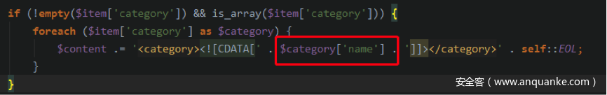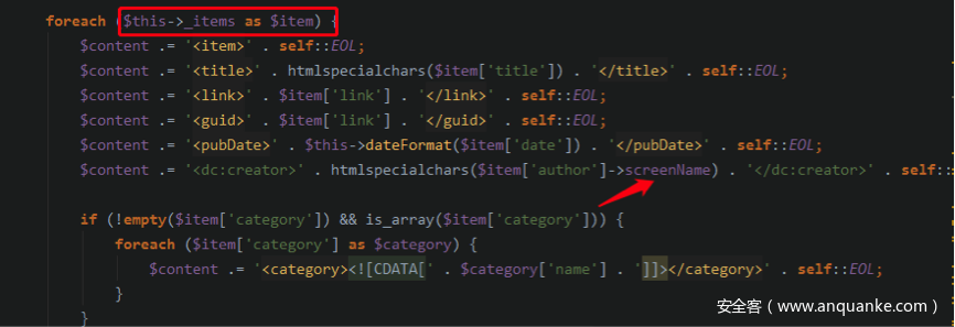 如上图所示,在Feed.php中__toString方法中第293行,可以给item[‘category’]赋值上对象,让其用数组的方式遍历对象时触发错误,强制退出程序。
