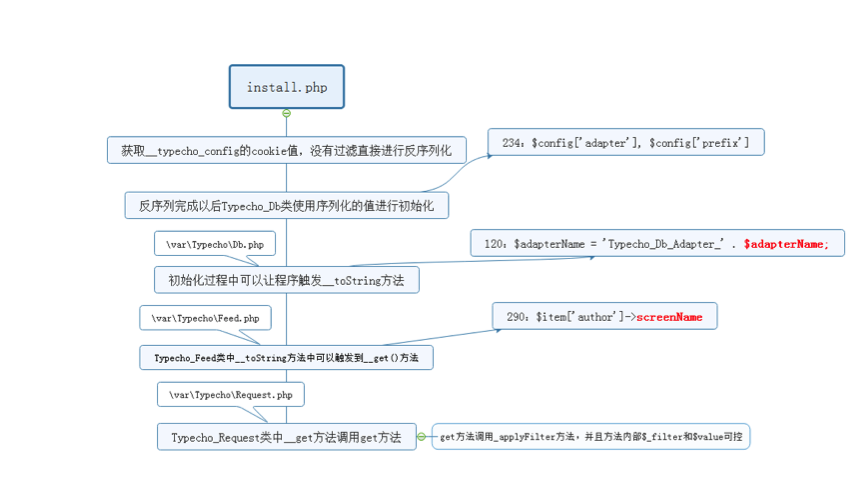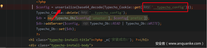 在install.php第232行获取了 ‘_typecho_config’ Cookie信息后未进行过滤直接进行反序列操作,导致这个入口点可以直接进行反序列化攻击。 如下所示: