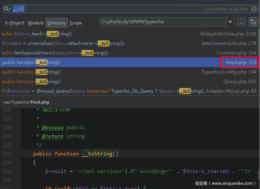 寻找到varTypechoFeed.php文件中有__toString()方法,类名为Typecho_Feed。