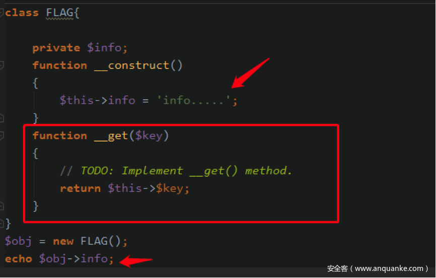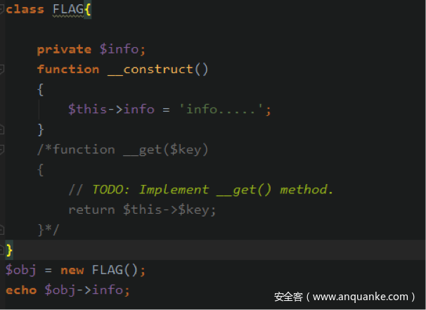 程序提示无法读取类型中info变量。 PHP为了解决这个问题,专门在类中设计了__get()魔术方法,当对象调用类中私有变量时将会自动触发该方法,通过__get()方法把数据读出来。