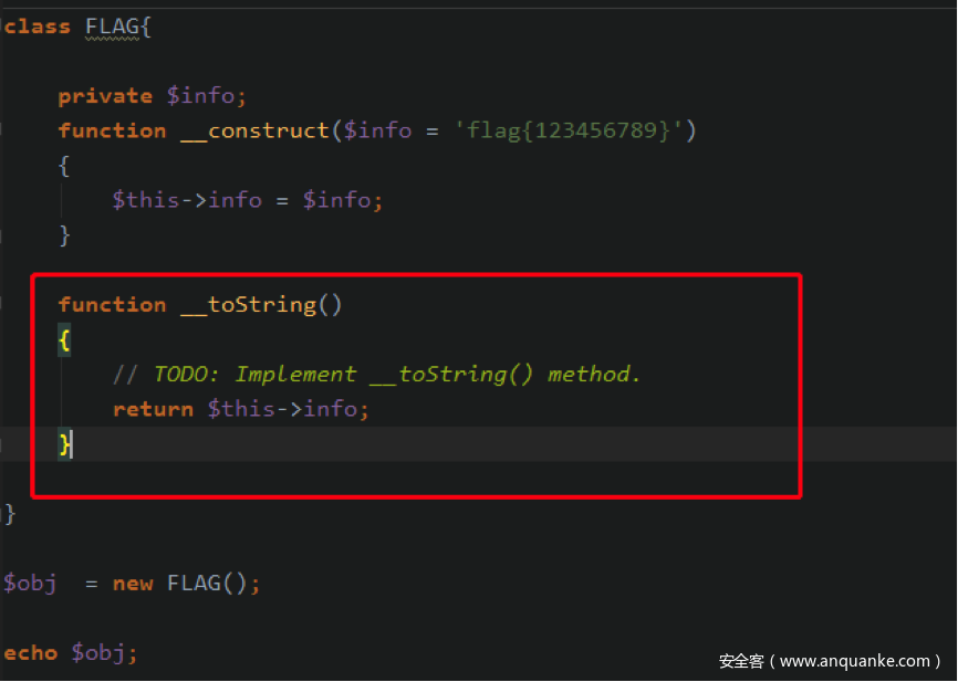 PHP开发者专门设计了相应的方法来解决此问题,大家是否记得new FLAG()时候,程序为什么会自动将$info变量设置为输入值,因为,当初始化时候,程序会自动调用__construct方法进行初始化,所以当对象作为字符串的时候,程序会自动调用__toString魔术方法。