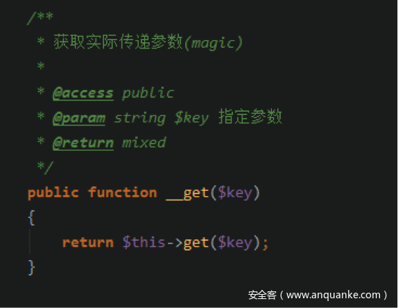 寻找程序文件内部有__get()方法的类,最后选定varTypechoRequest.php文件中的Typecho_Request类,分析__get()方法。