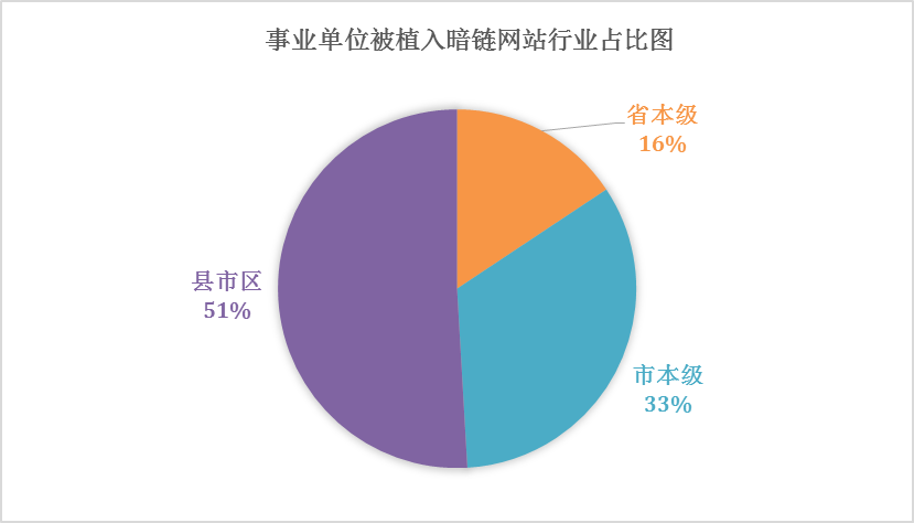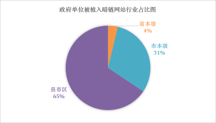 通过上图,可以很明显看出基本都是县市区的网站被植入暗链较多,占比过半,主要原因是,县市区的小网站更新频率低,往往几个月不会更新一次,甚至没人维护,而且事业单位或者政府网站通常比较稳定,较少出现没几天就消失不见的情况。