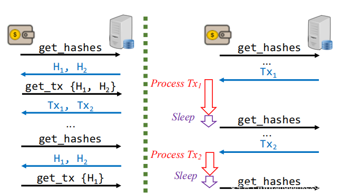 这个问题是有害的,Zcash最近发布的mobileSDK也有相同的缺陷:移动钱包反复出现:(1)从远程节点请求新交易; (2)处理这些交易; (3)休眠一段固定的时间。