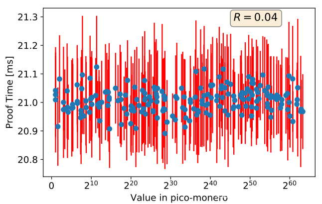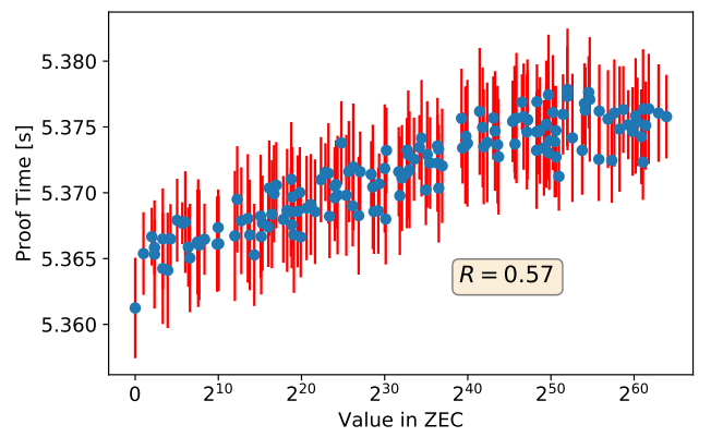 本文证明,对于Zcash的zkSNARK系统,证明时间在很大程度上取决于证明者证人的价值。特别是,对于匿名交易,证明证明时间与交易的机密价值密切相关。
