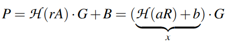 其中H:{0,1} *→Zq是一个哈希函数。公用密钥P和R = rG包含在事务中。请注意,P隐藏了爱丽丝的公钥(A,B)。