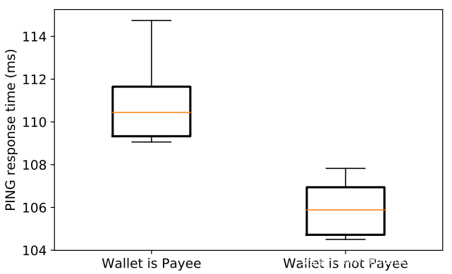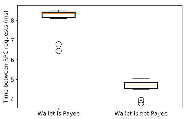 Monero:对于Monero,其中的钱包和节点在单独的流程中运行,证明付款的接收会改变钱包及其节点之间的通信模式。如果钱包连接到远程节点(在移动钱包中很常见,或者在首次与网络同步时很常见),如果钱包是最近交易的收款人,则被动网络攻击者可以推断出该钱包。此外,即使用户的钱包和节点位于同一位置,研究也表明,远程攻击者可以通过引起并观察节点资源上的锁争用来推断钱包到节点的通信模式。在WAN中验证这种计时攻击,攻击者(位于伦敦)推断受害者(在苏黎世运行一个节点和钱包)是否收到了付款。