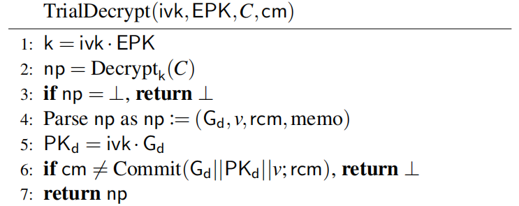 也就是说,如果解密C成功(这意味着用户是交易的收款人),则用户将检查Note明文np是否包含Note承诺cm的有效开头。