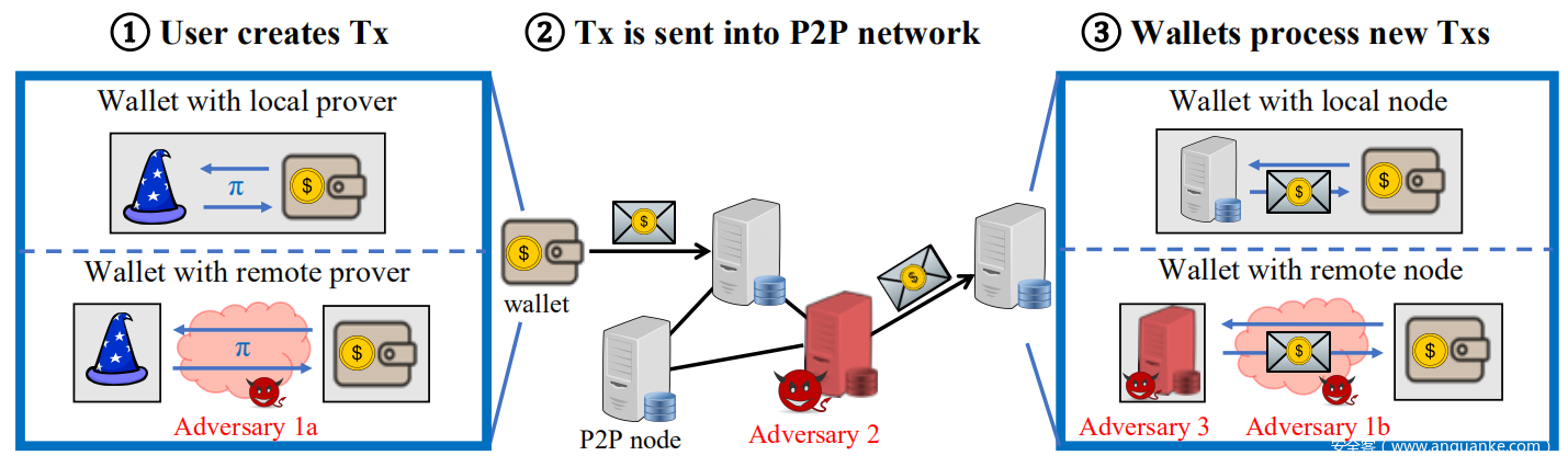 1.网络攻击者(上图中的Adverary 1a和1b)被动地监视受害者钱包和远程服务(例如节点或证明者)之间的加密流量。