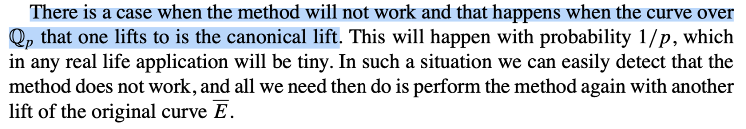 但是当提升后的Q_p上的曲线同F_p上的曲线同构(即出现canonical lift的情况)时,在(1)式(计算k的最终表达式)中的分子和分母均为0,此时我们无法再正确计算出k的值: