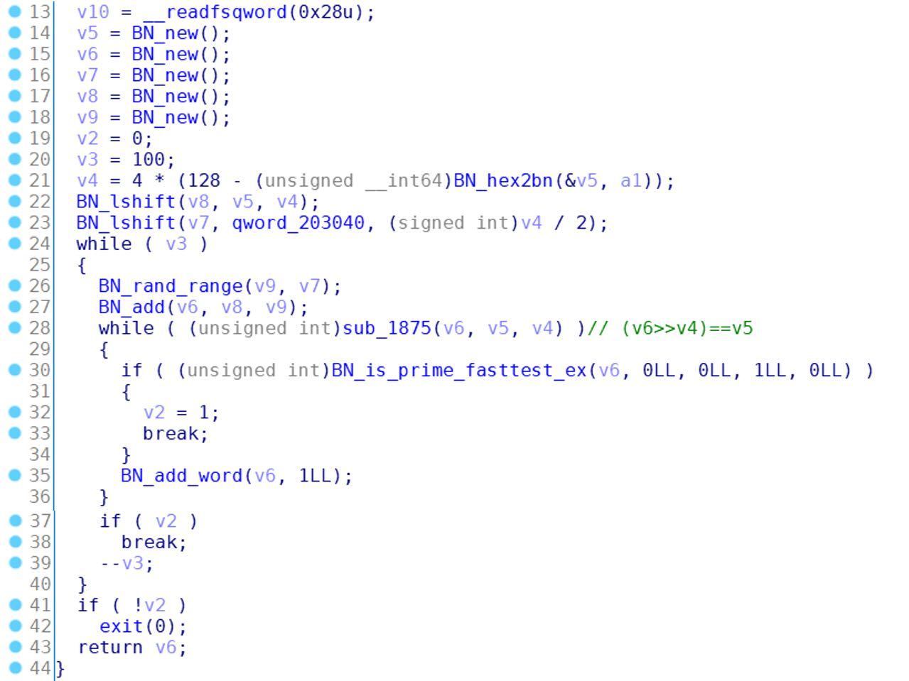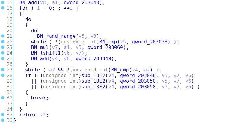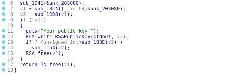 其中k_0和k_1是区间[0, r + 1)上的2个随机数,接下来sub_165E函数根据p和q来生成一对RSA公私钥,然后sub_1E25函数再通过PEM_write_RSAPublicKey函数以PEM格式打印公钥(e = 65537, N = p * q)。