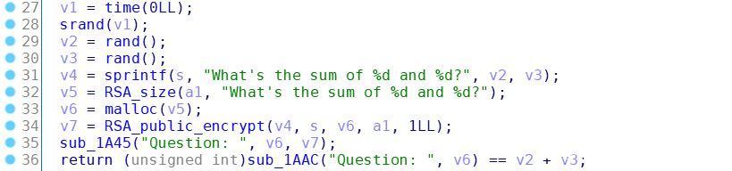 接下来程序调用sub_1B3E函数,该函数首先生成2个32比特的随机数x和y,然后使用前面生成的RSA公钥对字符串"What's the sum of " + str(x) + " and " + str(y) + "?"进行加密,并将加密后的密文以16进制形式打印给选手,此即为"Question"字符串后面的16进制串。接下来接收用户输入,如果用户输入的数等于x + y的值,则将FLAG经过前面生成的RSA公钥加密后的密文打印给选手,否则程序结束。