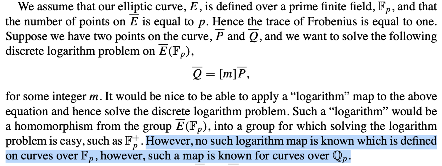 那么接下来我们要分析的问题就是一条anomalous曲线在什么情况下会使得题目中给出的Smart’s attack的实现失效,查阅论文资料可以发现,Smart’s attack的思路是通过将F_p上的曲线提升到Q_p上来实现对ECDLP的化简计算的: