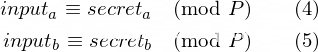 那么要想按照这种利用ORACLE + 二分搜索的方法恢复出FLAG,首先我们需要先从服务器上泄漏出素数P的值,我们可以先利用两次功能1,提交两个其整数形式的值大于P的不同的字节串作为secret,设其对应的整数形式的值分别input_a和input_b,然后将得到的share分别提交到功能2,设恢复出的内容为secret_a和secret_b,则有: