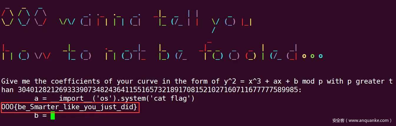 然后我们来看一下预期解,服务器首先要求选手提供一条椭圆曲线的a、b和p这3个参数的值,要求该曲线为anomalous曲线(即曲线的阶等于p)且p的值大于某一阈值,接下来服务器会随机选择该曲线的一个基点G并打印给选手,然后要求选手提交该曲线上的一个点G * k,随后服务器会用Smart’s attack对选手提供的曲线和点进行攻击,如果服务器成功计算出了k,则选手失败并中断连接,否则选手拿到FLAG。