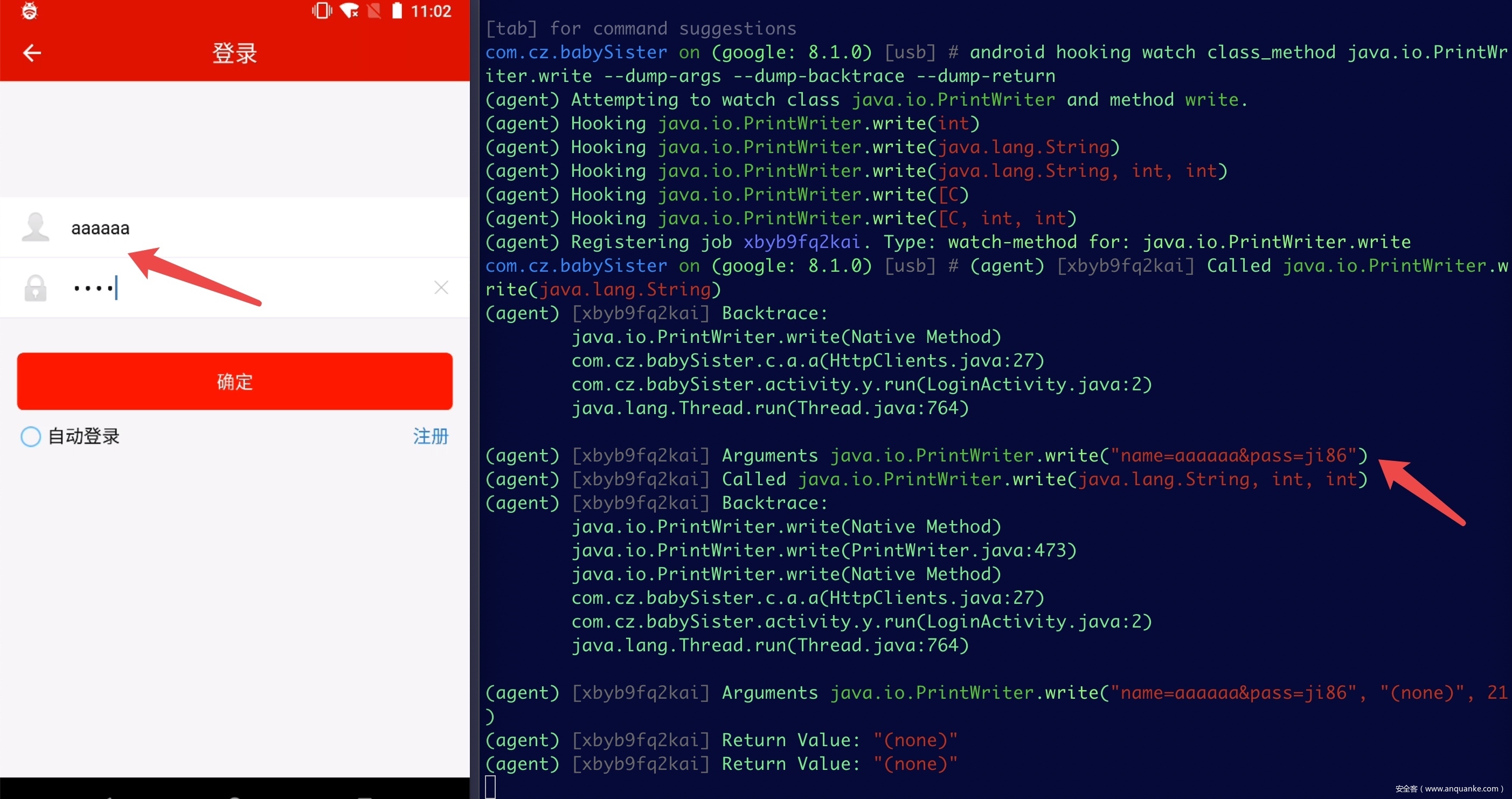 编写hook脚本将java.io.PrintWriter.write内容进行打印,可以发现显示出了用户输入的账号和密码。
