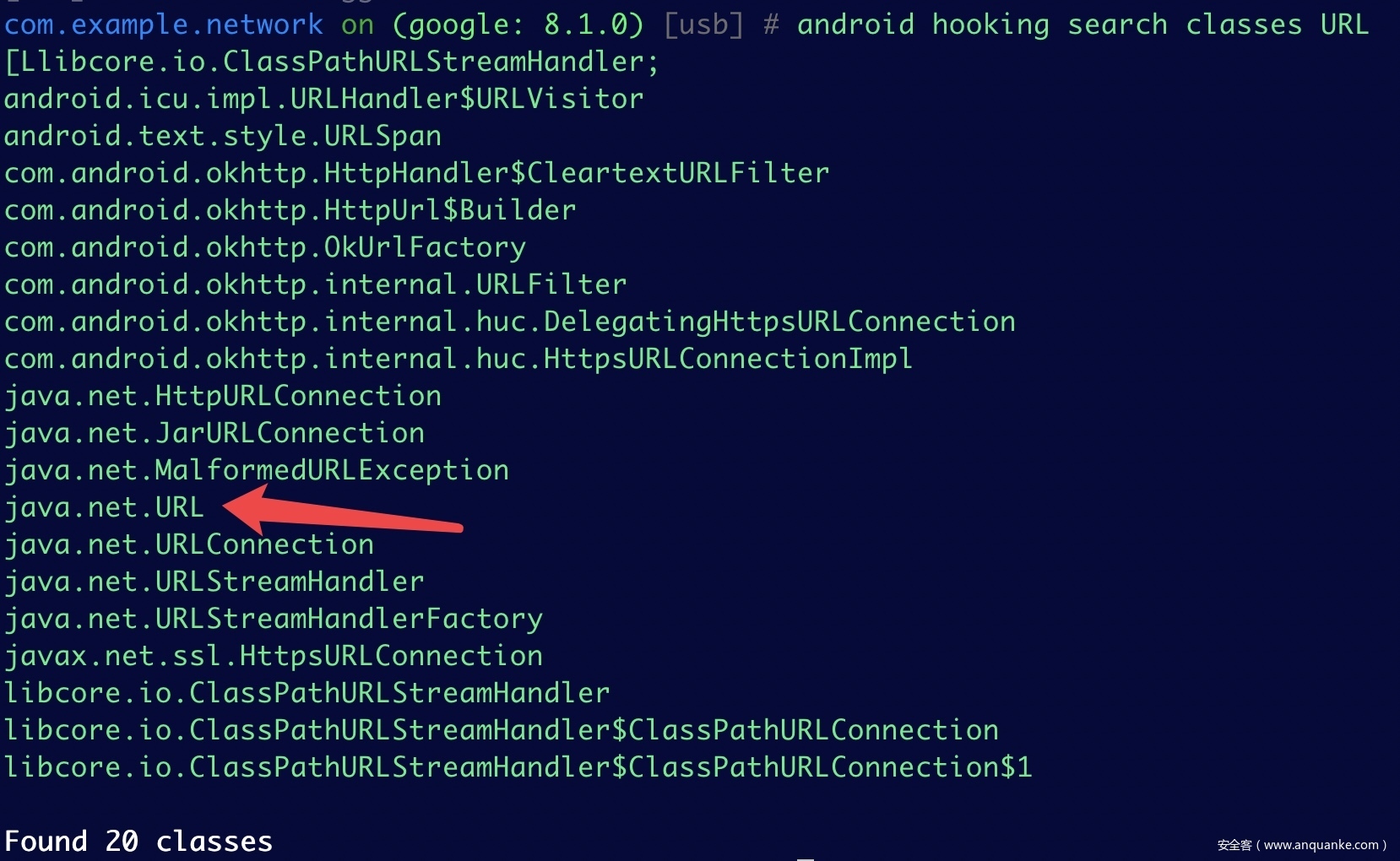 com.example.network on (google: 8.1.0) [usb] # android hooking search classes URL