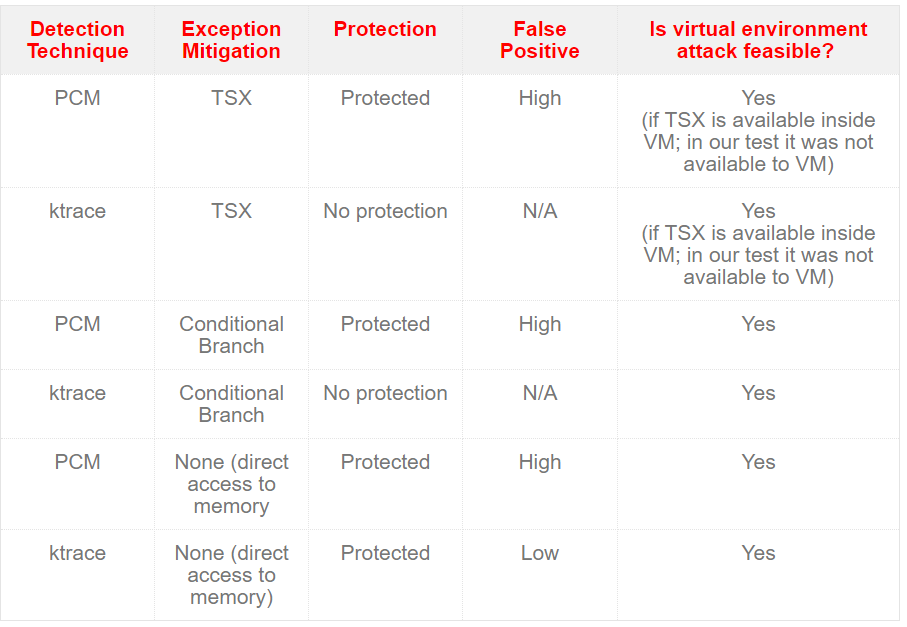 上图中需要注意的是:Spectre以及Meltdown的PoC代码可以使用“Conditional Branch(条件分支)”方法避免出现异常,这种情况下ktrace无法检测或者防护此类攻击方式。