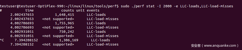此外,我们还可以选择使用LLC-loads以及LLC-load-misses计数器,因为这两者都与LLC有关。然而,需要注意的是这些计数器都是特定型号型计数器,在某些环境中可能无法使用。比如,我们无法在基于Sandy Bridge微架构运行的物理机上获取LLC-load-misses信息,然而却可以获取LLC-loads信息。