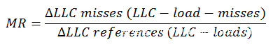 1、我们为每个逻辑CPU设置了两个perf事件(LLC-references以及LLC-misses),测量了每个CPU上的所有进程/线程。在超过采样周期P之后才读取计数器值。我们使用如下公式计算LLC丢失率: