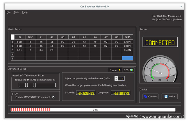 Bicho通过开源的“Car Backdoor Maker”桌面软件进行预先编程。在使用后门之前,需要通过USB连接到运行该软件的计算机,并预先加载各种有效载荷以便远程注入。