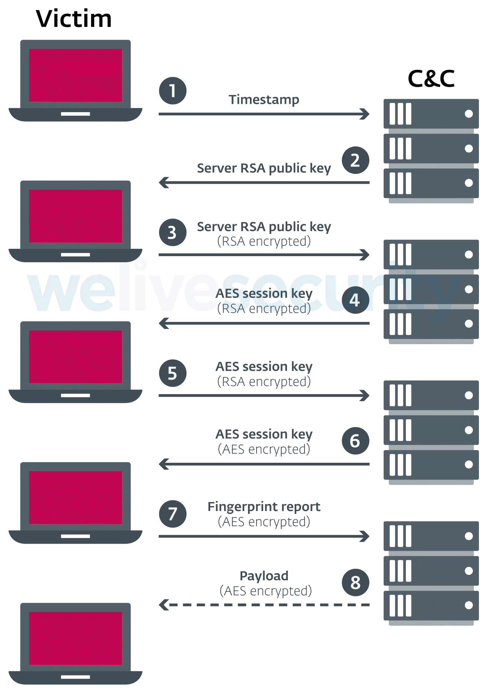 我们认为此次攻击活动是OceanLotus Framework B的衍生版,后者是Volexity研究人员在2017年分析的一种水坑攻击方案。然而,这次攻击者加大了攻击复杂度,使分析人员更加难以分析其恶意框架。攻击者做了许多改进,比如使用公钥加密算法来交换AES会话密钥,使用该密钥来加密后续通信数据,避免安全产品拦截最终攻击载荷。在通信协议方面,攻击者从HTTP切换到WebSocket,以便隐藏恶意通信数据。
