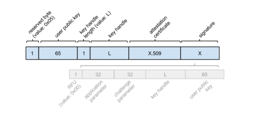 最后的签名是对之前提到application parameter,challenge parameter,key handle, user public key数据进行签名得到的,(上图下半部半透明部分)用于保证数据没有被篡改。签名算法使用的是ECC NIST-P256曲线签名算法。