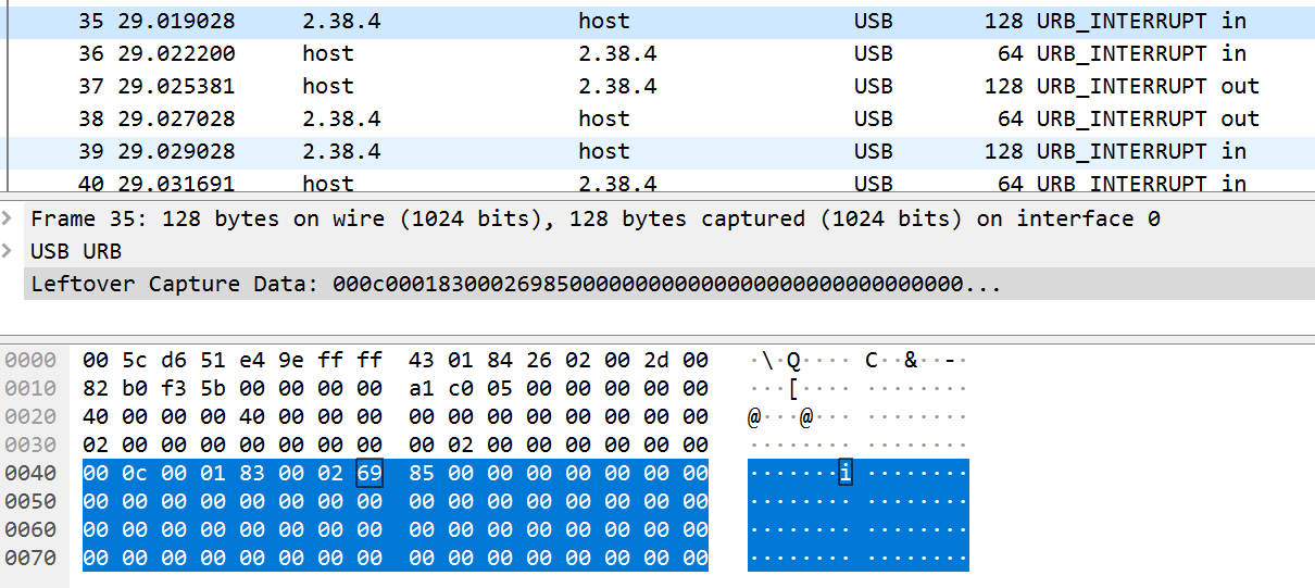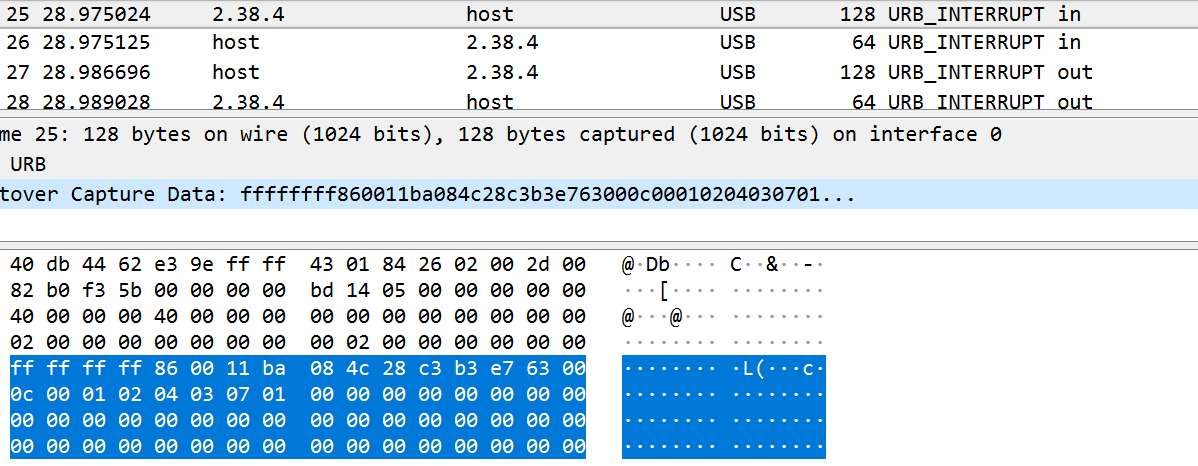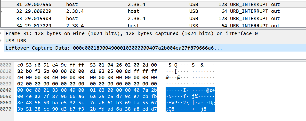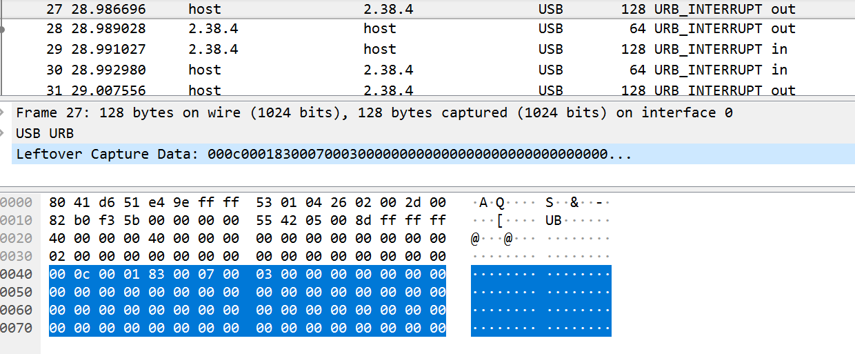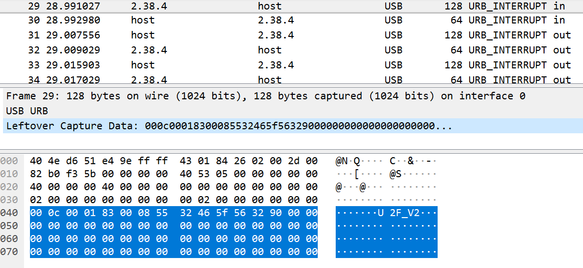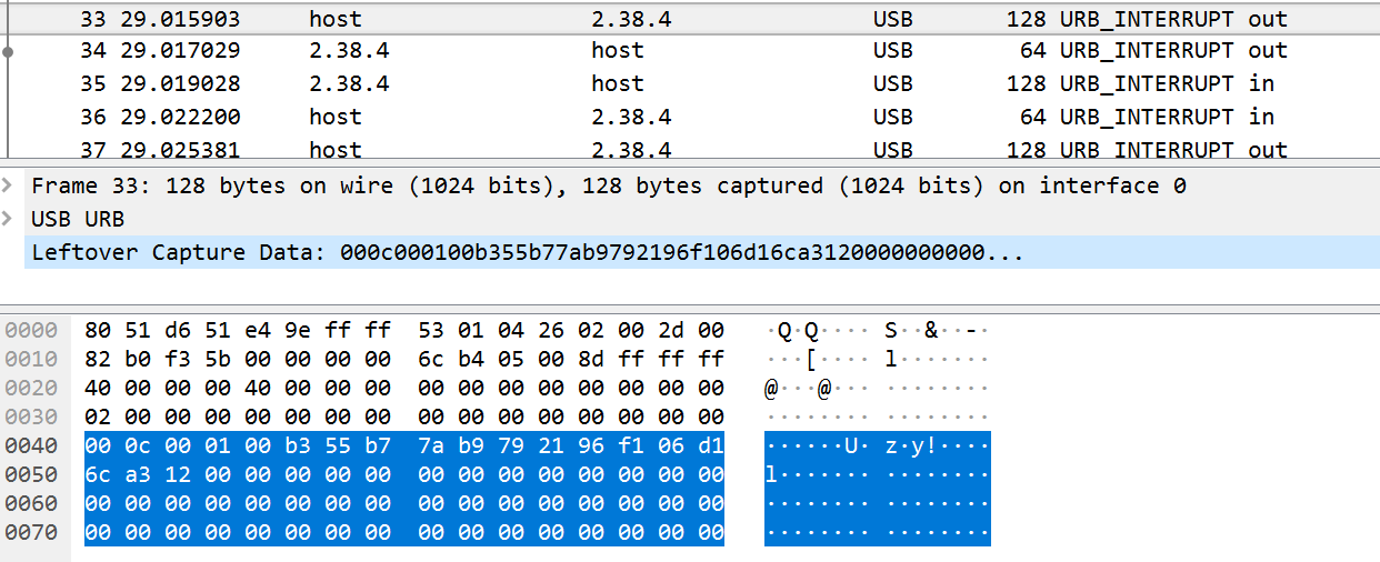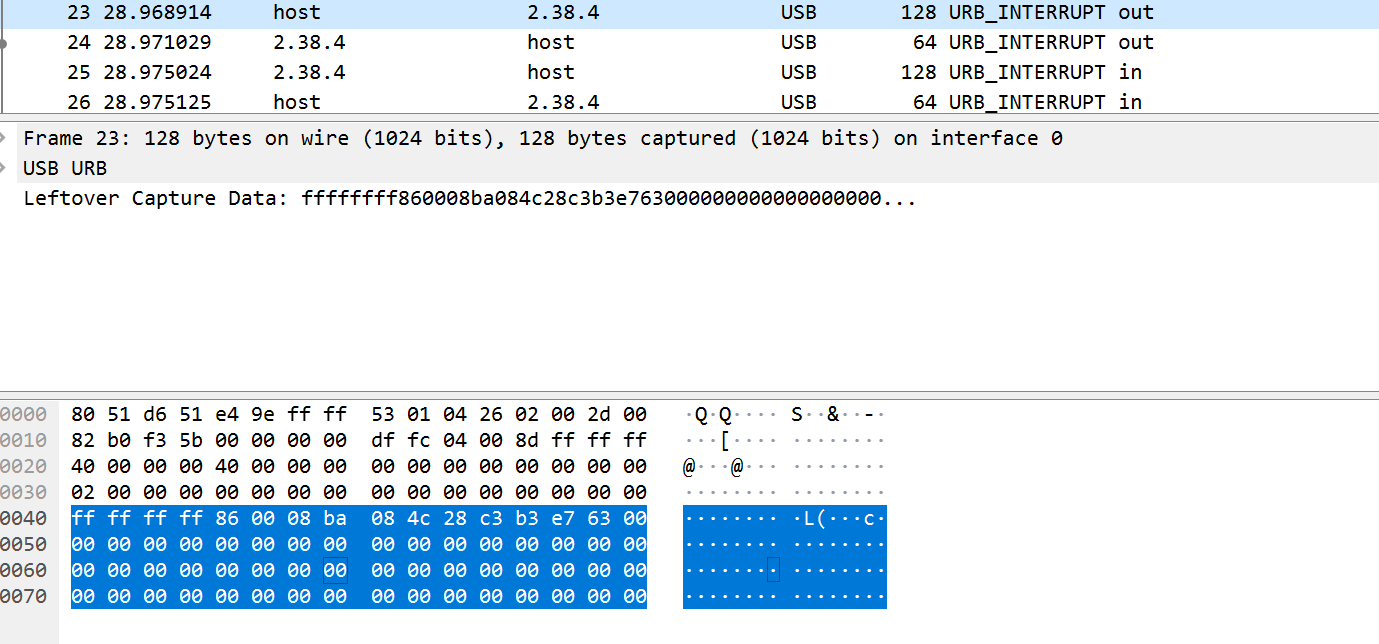 第一个包是23号包,从方向上看,是主机发给yubikey的。包的头64个字节,即0x40之前的部分是USB帧的内容。从0x40开始是U2F-HID包的内容,即截图下部蓝色加深的部分。