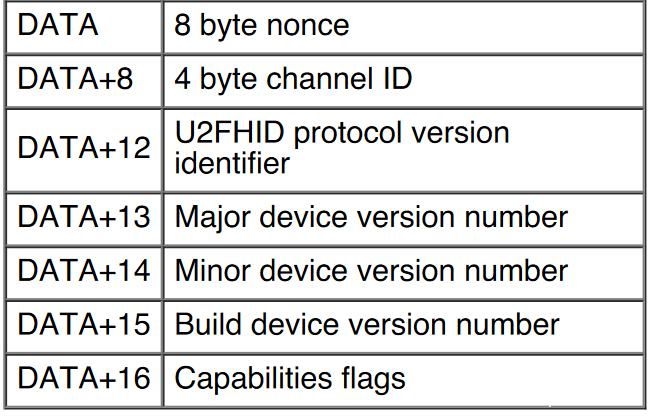 #define TYPE_INIT 0x80 #define U2FHID_PING (TYPE_INIT | 0x01) // Echo data through local processor only #define U2FHID_MSG TYPE_INIT | 0x03) // Send U2F message frame #define U2FHID_LOCK (TYPE_INIT | 0x04) // Send lock channel command #define U2FHID_INIT (TYPE_INIT | 0x06) // Channel initialization #define U2FHID_WINK (TYPE_INIT | 0x08) // Send device identification wink
