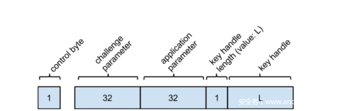 接下来是key handle的长度和key handle数据。Key handle是公私钥的句柄,用于标识公私钥。因为每一个网站都生成一对公私钥必然要对U2F设备的存储容量提出要求。因此,设备可以根据这个key handle重新生成公私钥对,这样,公私钥对就不需要存储在key中。