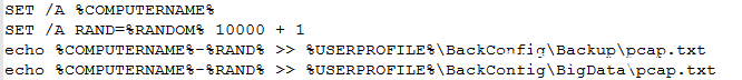 该BAT文件还会获取计算机名,将获取到的计算机名和5位随机数字组成字符串保存到%USERPROFILE%\BackConfig\Backup\pcap.txt中: