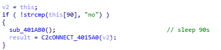 通过判断C2返回数据,根据不同指令执行不同操作,当指令为“no”时,则Sleep 90秒后再与C2继续通信: