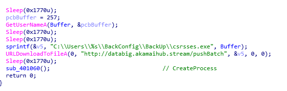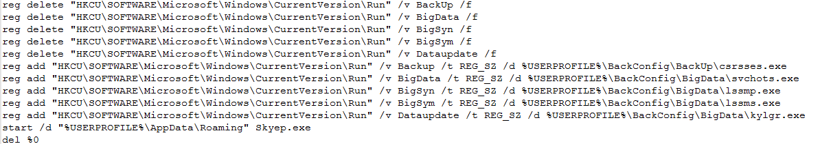 Skyep.exe的主要功能为下载执行,文件名则伪装成语音软件Skype,其会从http://databig.akamaihub.stream/pushBatch(还存活)下载文件保存到\BackConfig\BackUp\csrsses.exe并执行,且Skyep.bat文件中已经把该文件写入到自启动项: