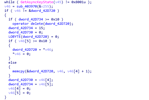 之后在%USERPROFILE%\Printers\Neighbourhood下创建格式为“用户名_年_月_日(时_分_秒)”的文本文件,用于记录当前的键盘记录,最后循环获取是否有键盘鼠标操作: