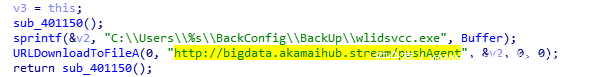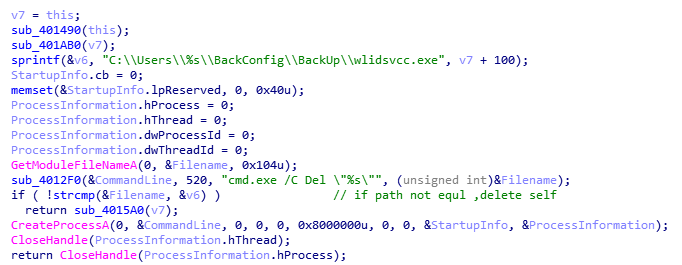 随后判断当前进程路径是否为%USERPROFILE%BackConfig\BackUp\wlidsvcc.exe: