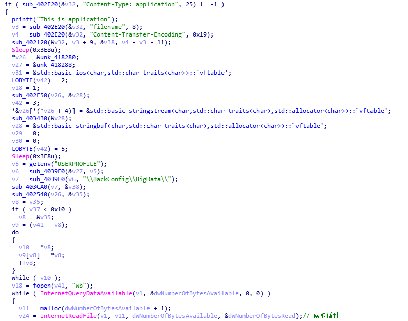 之后通过判断返回网络数据中的Content-Type进行后续操作:如果是“application”,则从C2获取文件保存到\\BackConfig\\BigData\\目录下: