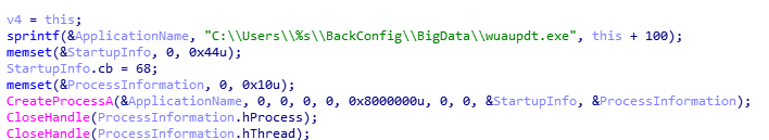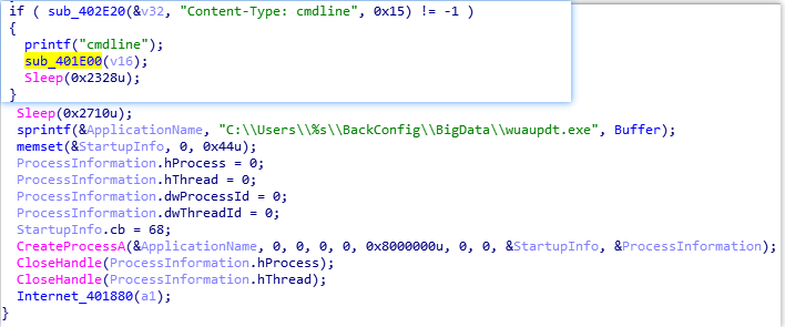 如果是“cmdline”,则执行\\BackConfig\\BigData\\wuaupdt.exe,并继续与C2通信: