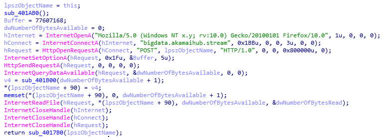 文件上传插件主要用于将%USERPROFILE%Printers\Neighbourhood\Spools目录下,由木马收集的敏感信息和文件上传到C2:bigdata.akamaihub.stream