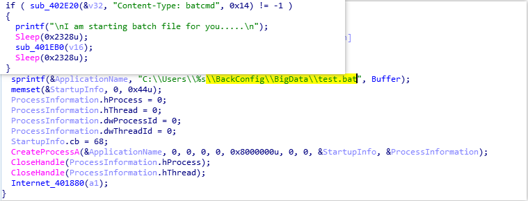 当等于“batcmd”时,则启动\\BackConfig\\BigData\\test.bat,并且继续与C2通信: