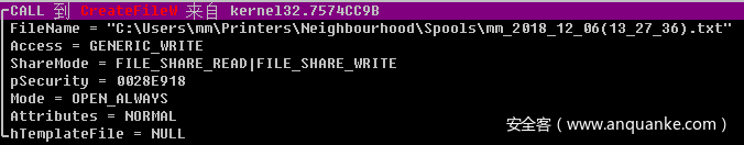 当找到有以上扩展名的文件后,将文件名与最后的修改日期写入当前目录下的test.txt文件中,并将搜集到的文件加上txt后缀后复制到%USERPROFILE%\Printers\Neighbourhood\Spools目录下:
