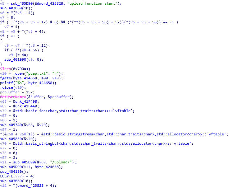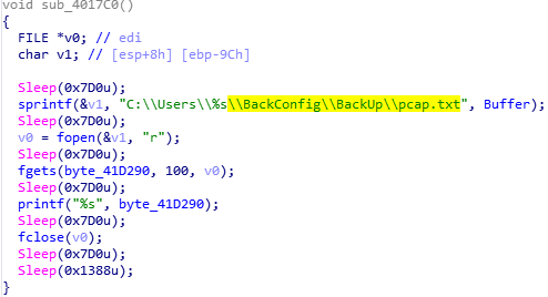 样本主要功能是与C2通信获取后续插件执行,首先从\\BackConfig\\BackUp\\pcap.txt读取出计算机名: