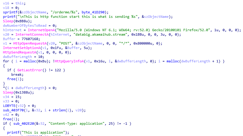 然后将计算机名封装成字符串:“orderme/计算机名-随机数”,以POST方式与C2:databig.akamaihub.stream进行通信,获取后续命令执行: