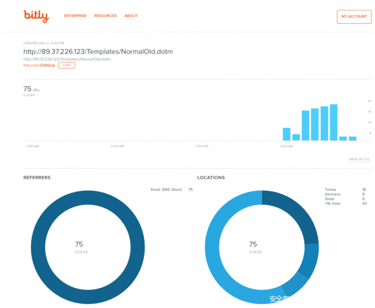 上述hxxps://bit[.]ly/2G8QrgL短网址会重定向到一个托管远程模板hxxp://89.37.226[.]123/Templates/NormalOld.dotm的URL。值得注意的是,此前出现在Dear Joohn行动中的恶意文档并没有使用短网址来下载远程模板,这表明在此行动中使用的技术已经发生了改变。幸运的是,这个短网址为我们提供了一些有关访问者及其所处国家的统计数据。如图4所示,这个短网址是在2018年12月3日下午12:56创建的,截止到2018年12月5日,一共被访问了75次,其中大部分来自土耳其。