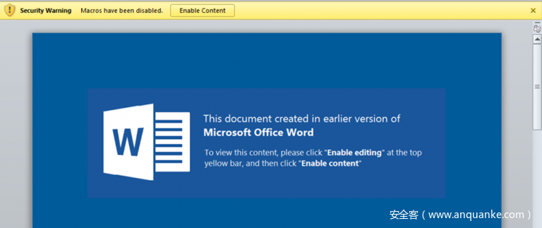 与Dear Joohn行动一样,该恶意文档也会通过HTTP下载一个远程模板(SHA256:07646dc0a8c8946bb78be9b96147d4327705c1a3c3bd3fbcedab32c43d914305),而该模板同样使用了出现在Dear Joohn行动中的作者名:xxx。在打开该恶意文档之后,可以看到如图3所示的诱饵图片,它旨在诱使收件人点击“Enable Content(启用内容)”,以运行包含在远程模板中的恶意宏。