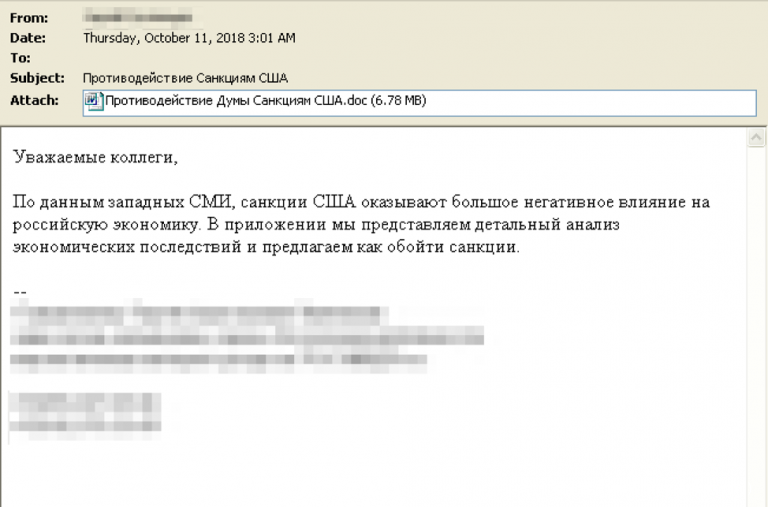 这起攻击发生在2018年10月11日,攻击媒介是一封鱼叉式网络钓鱼电子邮件,讨论的是美国新制裁对俄罗斯经济的影响。“From(发件人)”字段和正文末尾的签名均包含目标组织工作人员的姓名,而“To(收件人)”字段为空。这使得我们有理由相信,目标个人被包含在了“Bcc(抄送)”字段中。图1展示的是在这起攻击中使用的钓鱼电子邮件。