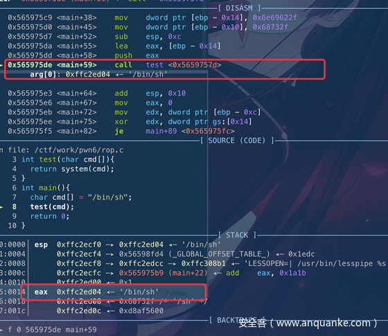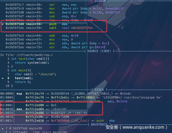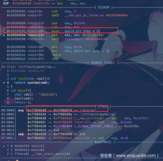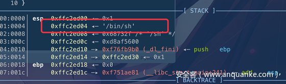 这里可以看到他是通过push dword ptr [ebp+8]来获取到/bin/sh,然后压入新栈作为system的参数