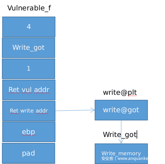 1.我们利用read函数溢出覆盖ebp,ebp+4 存放的是write函数参数(write的got表地址),下面依次是write函数的返回地址(vulnerable_function) 在到write函数地址